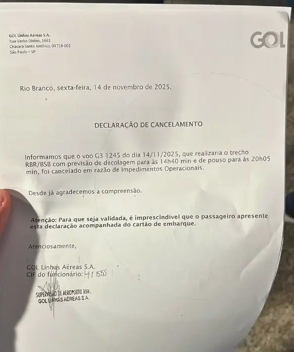 Na Declaração de Cancelamento, a Gol disse apenas que o voo foi cancelado em razão de impedimentos operacionais.