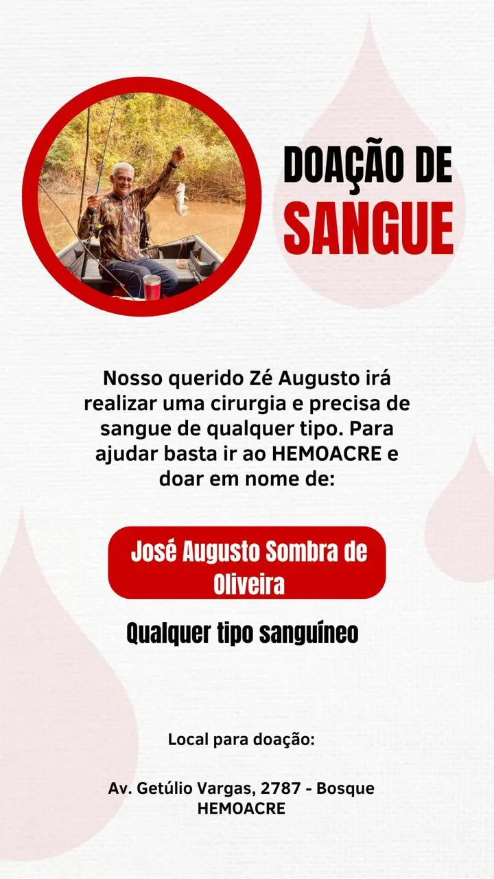 O morador da capital José Augusto Sombra de Oliveira, conhecido como Zé Augusto, está prestes a passar por uma cirurgia no dia 20 de novembro, quinta-feira, e necessita de doações de sangue com urgência. Qualquer tipo sanguíneo é aceito para auxiliar no procedimento.