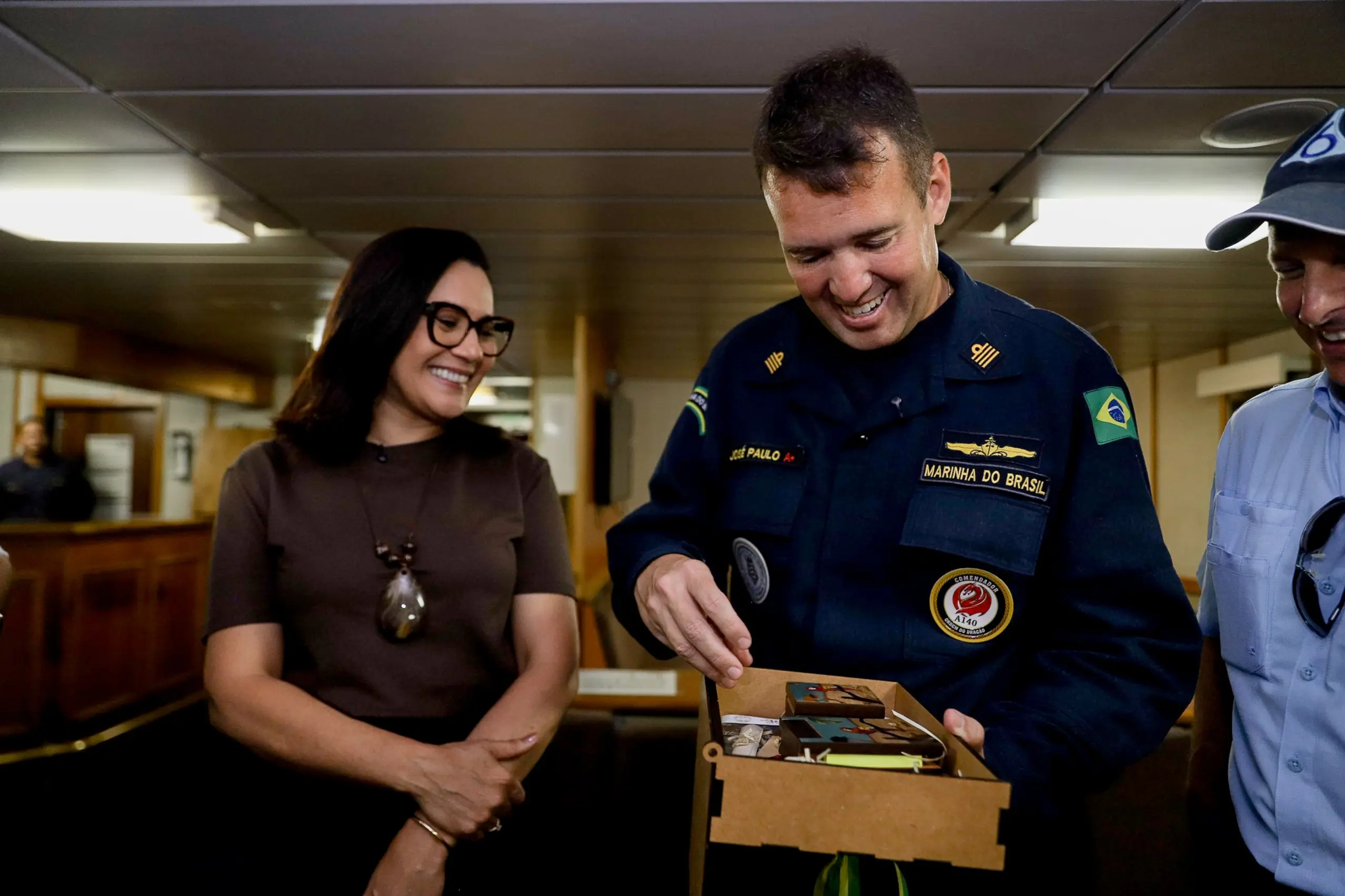 Ao final da visita, a vice-governadora presenteou o comandante com peças de marchetaria produzidas pelo artesão acreano Maqueson Pereira, destacando a cultura amazônica e a identidade artesanal do estado.