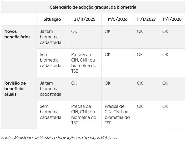 1º de janeiro de 2027 – Todas as renovações e novas concessões passam a exigir biometria. Beneficiários sem qualquer documento biométrico serão notificados e deverão emitir a CIN.
