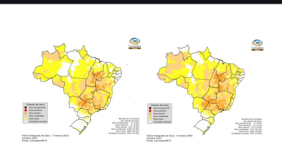 No estado, a análise mostra que regiões que vinham registrando seca moderada nos últimos seis meses passaram a apresentar seca fraca ou condições normais no mês de outubro, sugerindo uma atenuação do déficit hídrico.