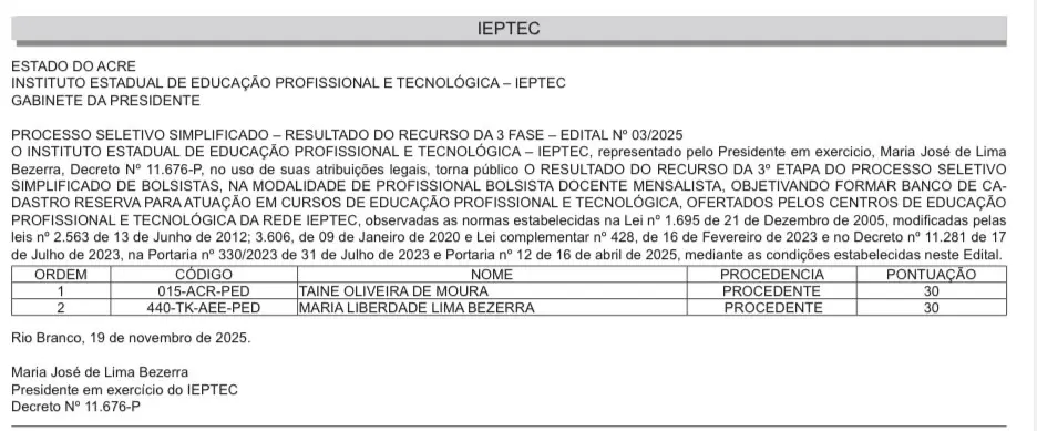 O Instituto Estadual de Educação Profissional e Tecnológica do Acre (IEPTEC) tornou público, nesta quarta-feira (19), o resultado do recurso referente à 3ª fase do Processo Seletivo Simplificado de bolsistas, conforme o Edital nº 03/2025. O documento foi assinado pela presidente em exercício do órgão, Maria José de Lima Bezerra, nomeada pelo Decreto nº 11.676-P.