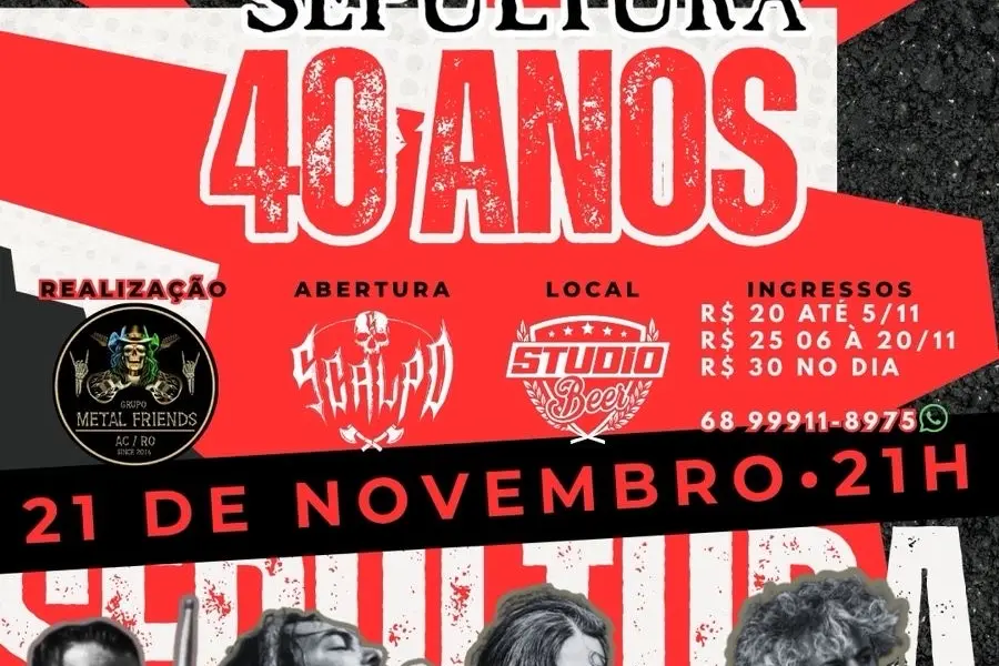 A banda brasileira de maior projeção mundial, o Sepultura, completou quatro décadas de carreira e, para celebrar esse marco histórico, Rio Branco terá um evento especial em homenagem ao grupo. O Tributo Sepultura 40 Anos acontece neste sexta-feira, 21 de novembro, às 21h, no Studio Beer, reunindo músicos acreanos para revisitar todas as fases da banda mineira que revolucionou o metal extremo.