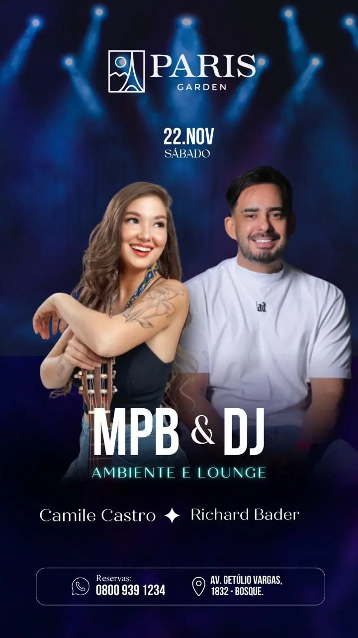 A música Camile Castro, conhecida no Acre por boas interpretações de música popular brasileira (MPB) e o DJ Richard Bader se apresentam na noite deste sábado (22), em Rio Branco, no Paris Garden, a partir das 18h00.