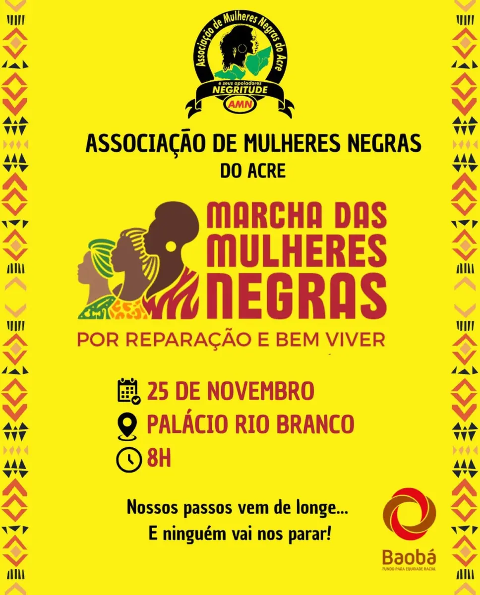 A concentração está marcada para às 8h, em frente ao Palácio Rio Branco, de onde as participantes seguem em caminhada pelo Centro da capital. O convite é aberto a mulheres negras, apoiadoras e coletivos aliados.