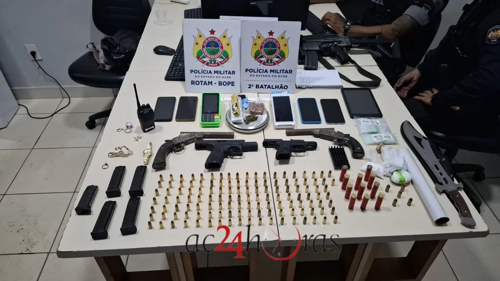 Durante as buscas, foram apreendidos:Duas escopetas calibre .28; uma pistola Taurus G2C 9 mm, carregada com 12 munições; uma pistola Taurus TS9, calibre 9 mm, com carregador de 17 munições; três carregadores extras com 17 munições cada; cartuchos calibre .28 e munições calibre .40; um colete balístico; porções de cocaína e maconha; balança de precisão e materiais usados no preparo e embalagem de drogas.