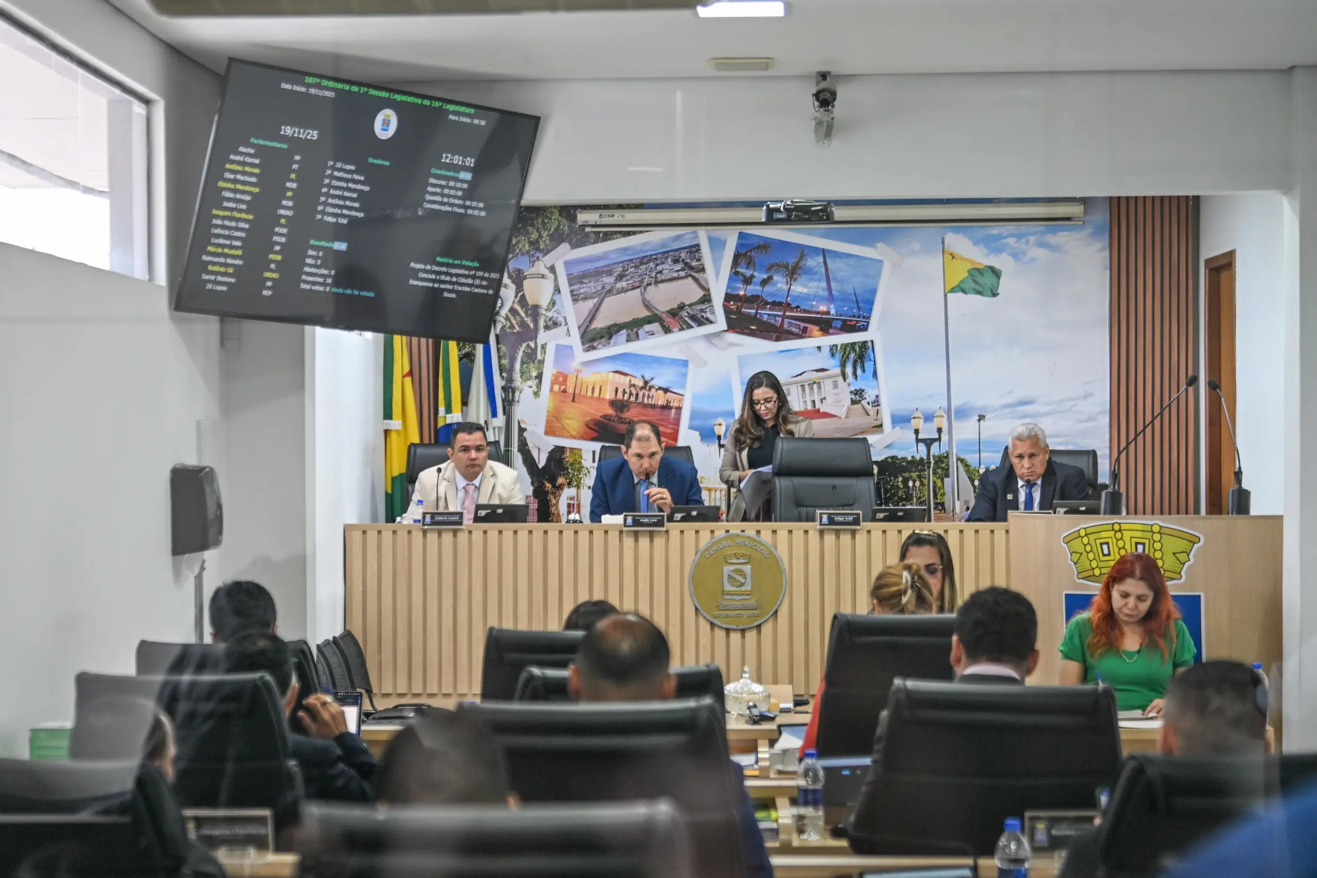 Após a reabertura da sessão desta terça-feira, os vereadores da Câmara Municipal de Rio Branco decidiram aprovar nesta terça-feira, 25, o projeto de lei que concede o título de cidadão rio-branquense ao secretário municipal de Agricultura, Eracides Caetano. A proposta, que havia sido rejeitada anteriormente, voltou à pauta por iniciativa do presidente da Casa, vereador Joabe Lira. O projeto teve 15 votos favoráveis e apenas um contrário, sendo da vereadora Elzinha Mendonça.