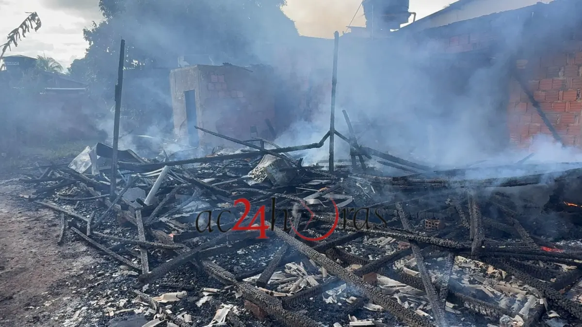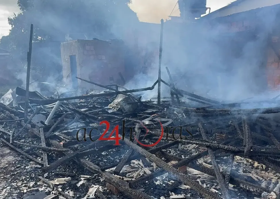 Um incêndio destruiu por completo uma casa de madeira na Rua Montevidéu, no Bairro João Eduardo I, região da Baixada da Sobral, em Rio Branco, na tarde desta quinta-feira (27). O morador conhecido como Litinho sofreu queimaduras ao tentar deixar o imóvel.