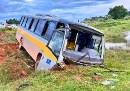 Um ônibus escolar da Secretaria Municipal de Educação de Plácido de Castro saiu da pista e caiu no sangradouro de um açude após ter a