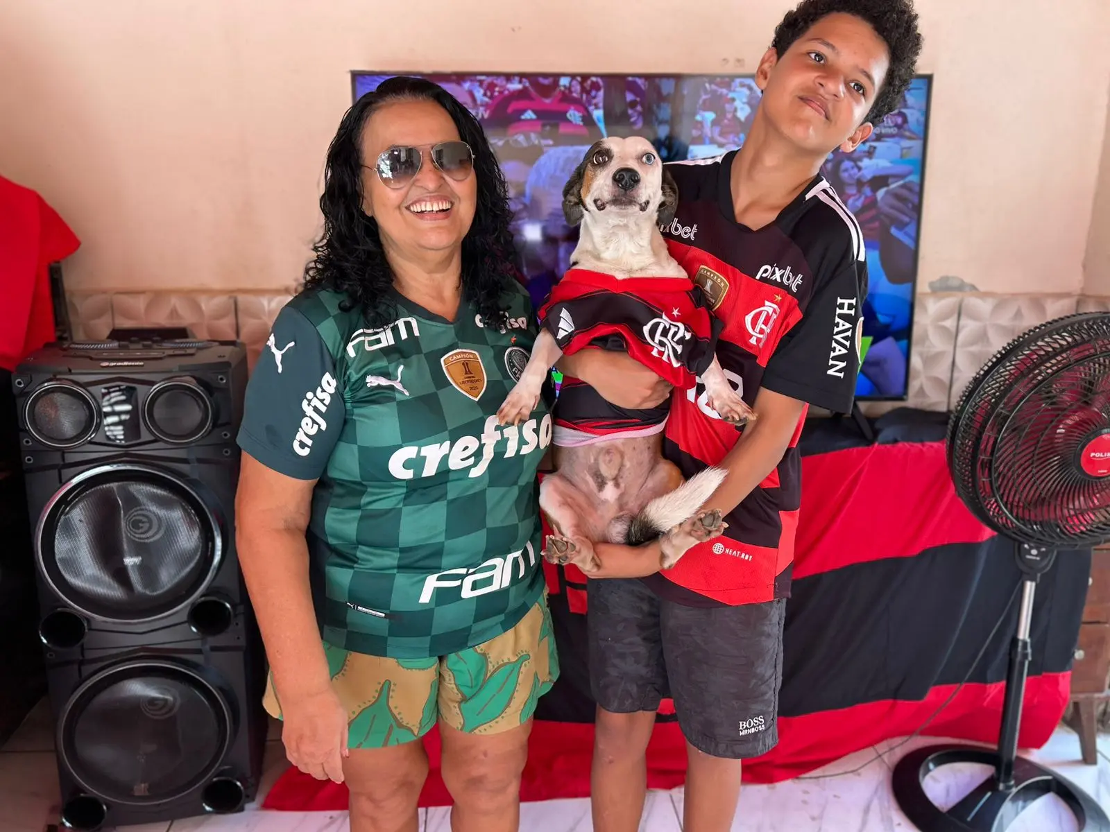Segundo Medeiros, a casa da dona Dagmar está tomada pela animação. As duas torcidas cantam, brincam e dividem o espaço sem rivalidade. Em tom descontraído, um dos familiares provocou os palmeirenses ao avisar qual seria o prato principal do almoço. “Estou assando porco”, brincou, arrancando risadas dos presentes.