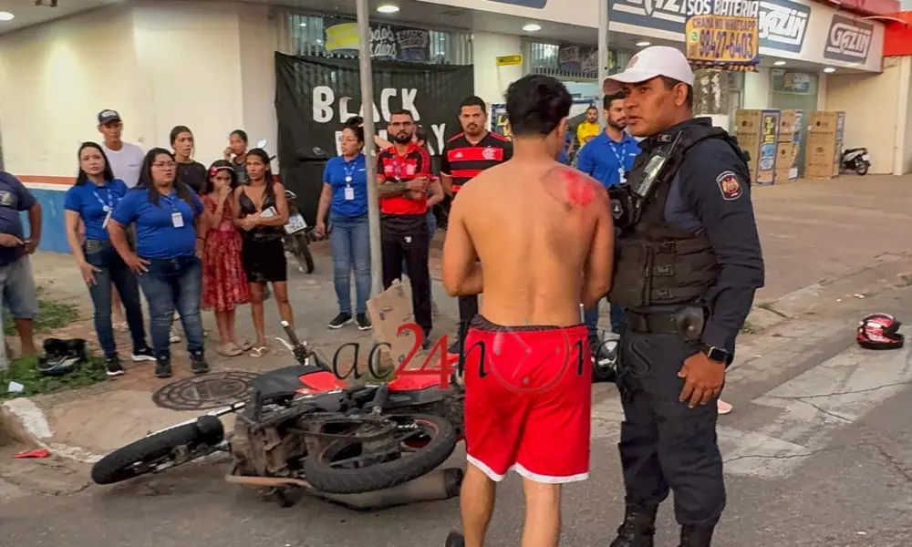 Uma colisão entre duas motocicletas deixou quatro pessoas feridas no final da tarde deste sábado (29), no cruzamento das ruas Nações Unidas e Pernambuco, no bairro Bosque, em Rio Branco. O acidente envolveu o motociclista de aplicativo Luiz Fernando Silva do Nascimento, de 33 anos, o adolescente de 13 anos que estava como passageiro, além dos jovens Gabriel Pereira Marques e Lucas Viriato Augustinho, ambos de 19 anos.