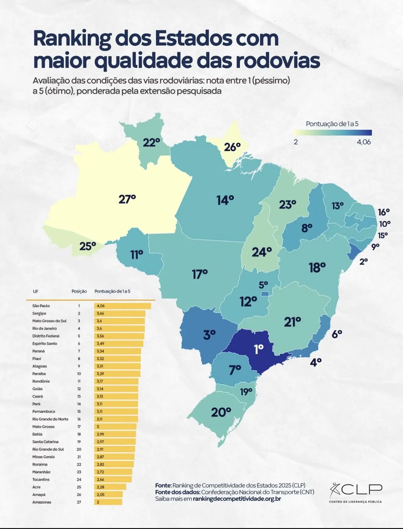 O indicador utilizado para o ranking integra o pilar de Infraestrutura do Ranking de Competitividade dos Estados 2025, elaborado pelo Centro de Liderança Pública (CLP), refletindo a importância das rodovias para o desenvolvimento econômico e logístico. Os dados foram disponibilizados pela Confederação Nacional do Transporte (CNT).