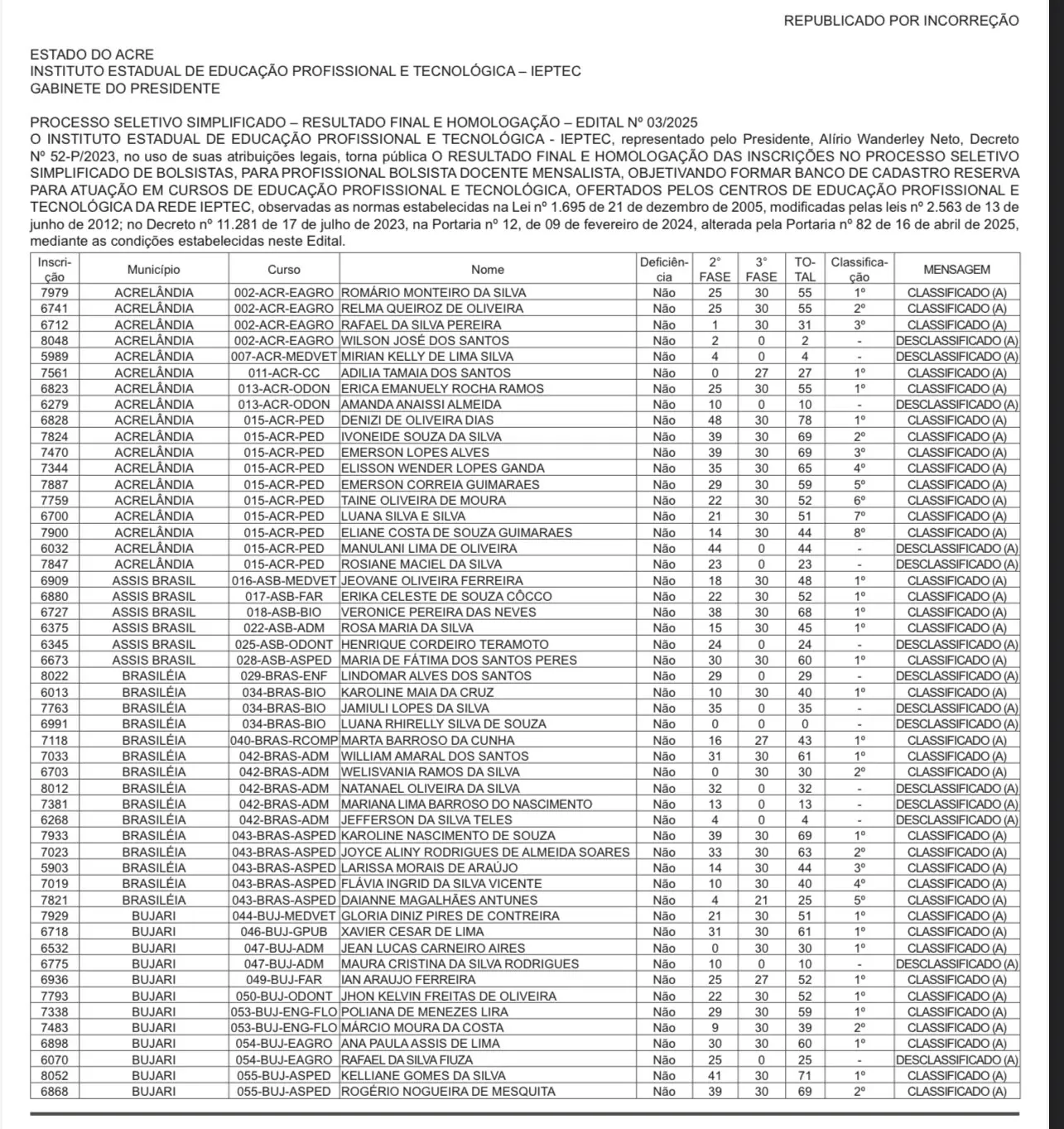 O Instituto Estadual de Educação Profissional e Tecnológica (IEPTEC) publicou, por meio de seu Gabinete da Presidência via Diário Oficial nesta segunda-feira, 1º, a relação de candidatos classificados e desclassificados no processo seletivo destinado à formação de cadastro reserva para atuação como profissionais bolsistas docentes mensalistas em cursos de Educação Profissional e Tecnológica oferecidos pelos Centros de Educação Profissional da rede.