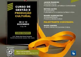 Estão abertas as inscrições para o Curso de Gestão e Produção Cultural, que será realizado de 8 a 12 de dezembro, das 14h às 18h,
