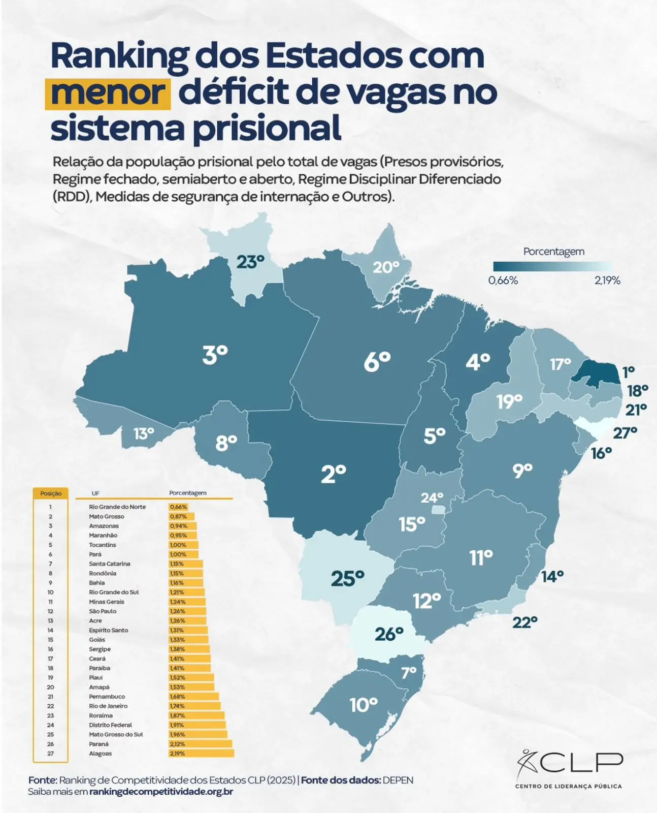 No topo do ranking aparece o Rio Grande do Norte, com o menor déficit do país, atingindo 0,66%. Já o estado com a pior situação é Alagoas, que apresenta déficit de 2,19%, o maior entre as 27 unidades federativas.