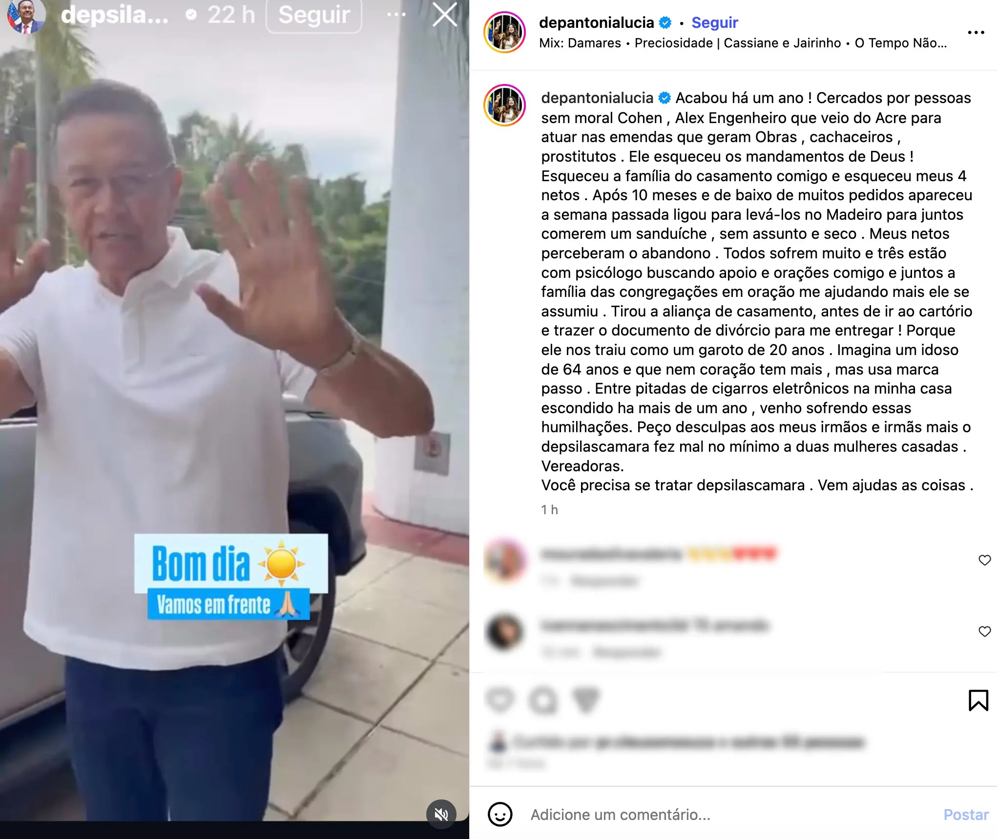 A deputada federal Antônia Lúcia (Republicanos–AC) voltou a usar as redes sociais para expor a crise no casamento com o também deputado federal Silas Câmara (Republicanos -AM). Em um desabafo publicado nesta terça-feira, 2, ela afirma que o marido, de 64 anos, teria deixado traído a família “como um garoto de 20 anos”.