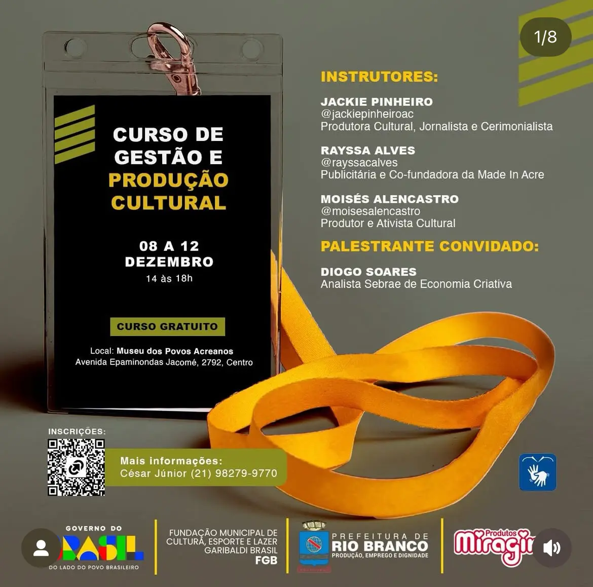 Estão abertas as inscrições para o Curso de Gestão e Produção Cultural, que será realizado de 8 a 12 de dezembro, das 14h às 18h, no auditório do Museu dos Povos Acreanos, em Rio Branco. A formação é totalmente gratuita e voltada a artistas, produtores culturais, estudantes e interessados em atuar no setor da cultura e da economia criativa.