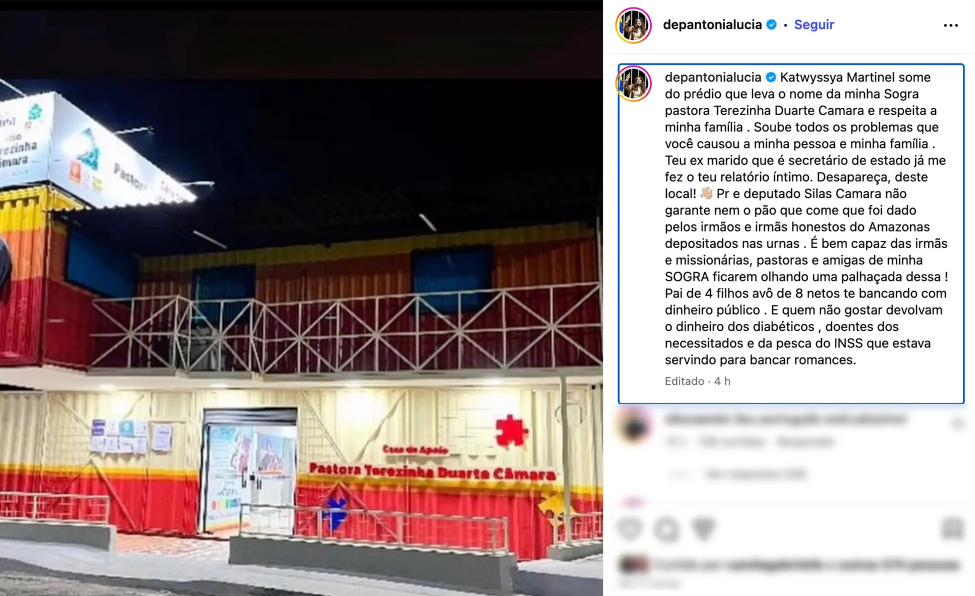 Na sequência, a deputada voltou a citar o marido. “Pr e deputado Silas Câmara não garante nem o pão que come, que foi dado pelos irmãos e irmãs honestos do Amazonas depositados nas urnas. É bem capaz das irmãs e missionárias, pastoras e amigas de minha sogra ficarem olhando uma palhaçada dessa! Pai de 4 filhos, avô de 8 netos te bancando com dinheiro público. E quem não gostar devolvam o dinheiro dos diabéticos, doentes, dos necessitados e da pesca do INSS que estava servindo para bancar romances”, disparou.