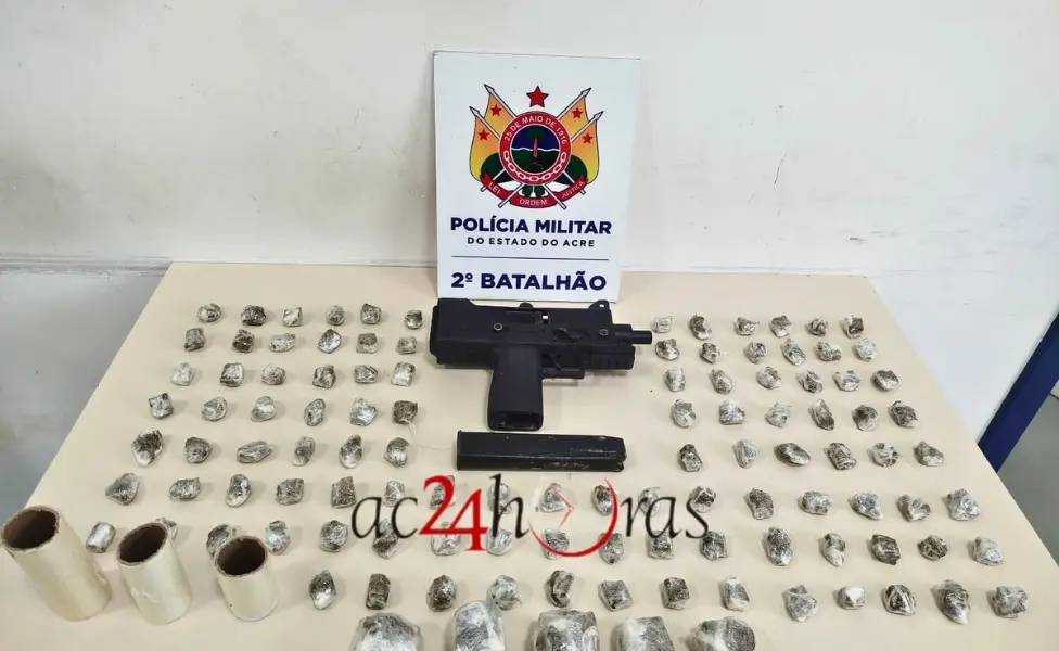Policiais Militares do 2º Batalhão localizaram, na tarde desta sexta-feira (5), uma submetralhadora calibre 9 mm e 112 porções de skank escondidas dentro de uma bolsa abandonada em uma residência em construção no Loteamento Nascer do Sol, no ramal da Palheira, em Rio Branco.