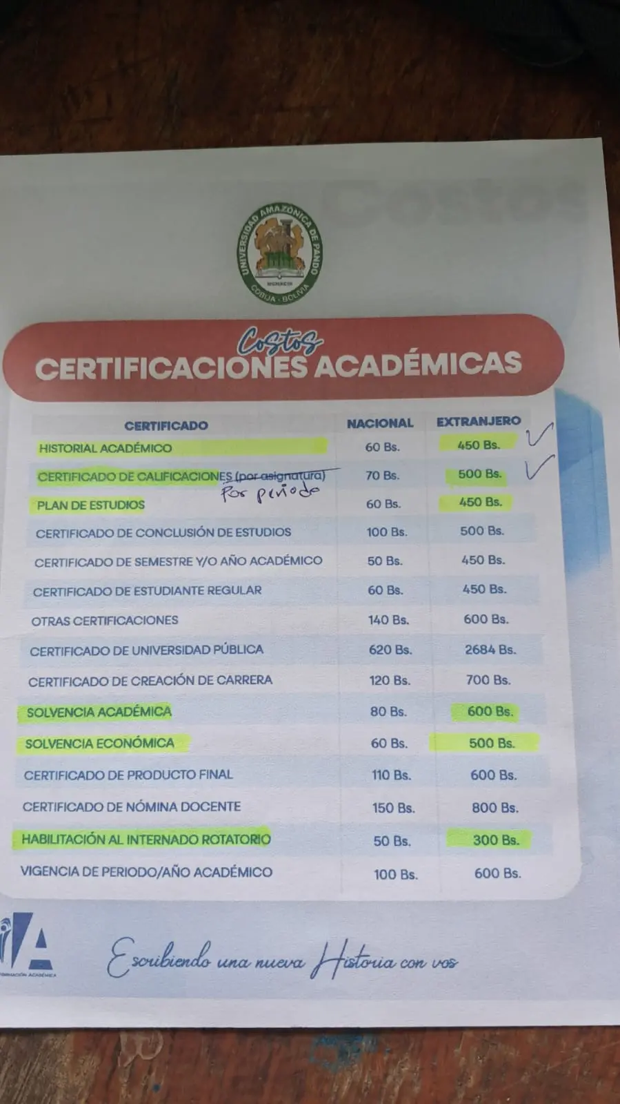 Historial Acadêmico: 60 Bs (bolivianos) / 450 Bs (estrangeiros);