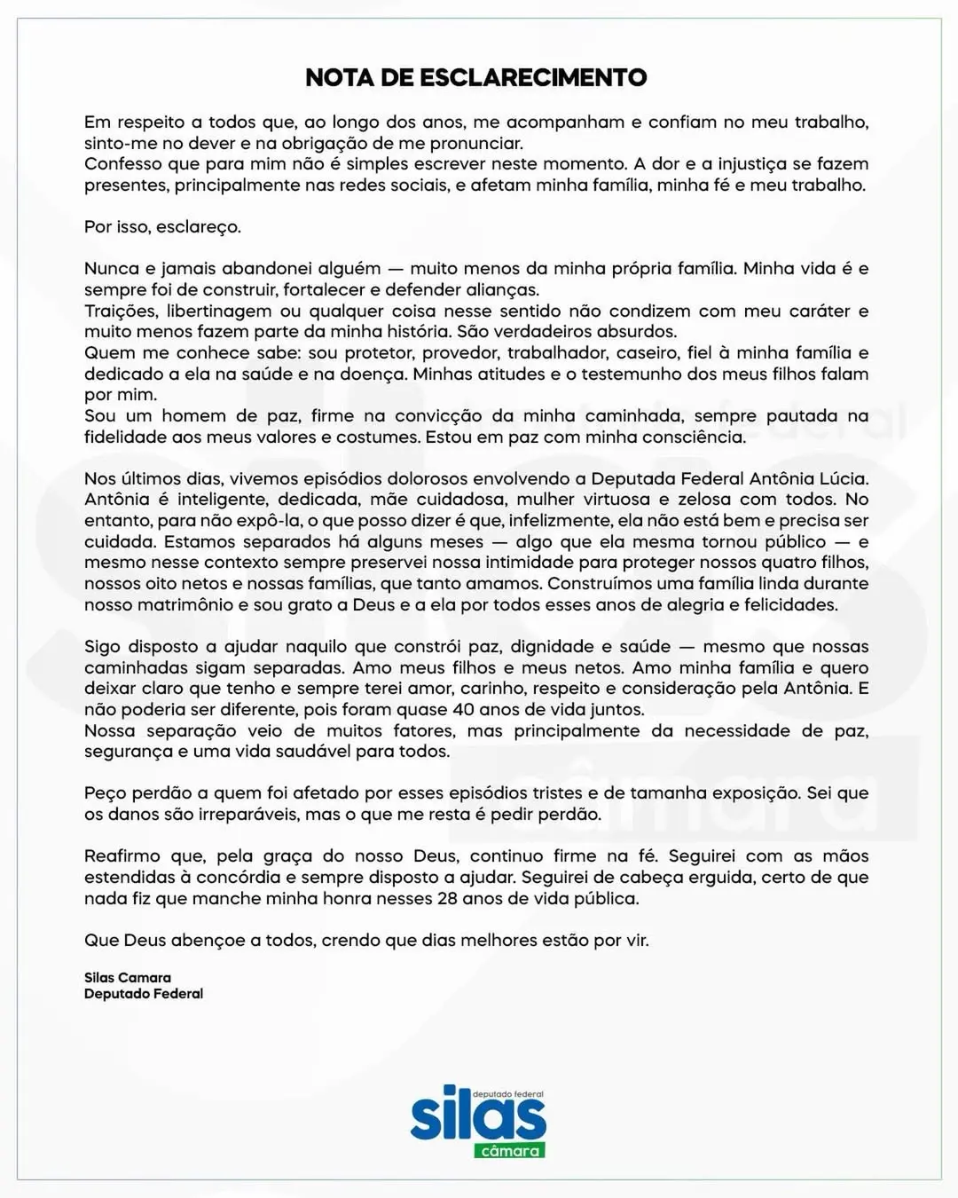 O parlamentar também reconhece oficialmente que ele e Antônia Lúcia estão separados “há alguns meses”, reforçando que a própria deputada tornou isso público recentemente. Ele atribui o desgaste da relação à busca por “paz, segurança e uma vida saudável para todos”. Sem entrar em detalhes, Silas sugere que a deputada estaria fragilizada emocionalmente. “No entanto, para não expô-la, o que posso dizer é que, infelizmente, ela não está bem e precisa ser cuidada”, afirmou.