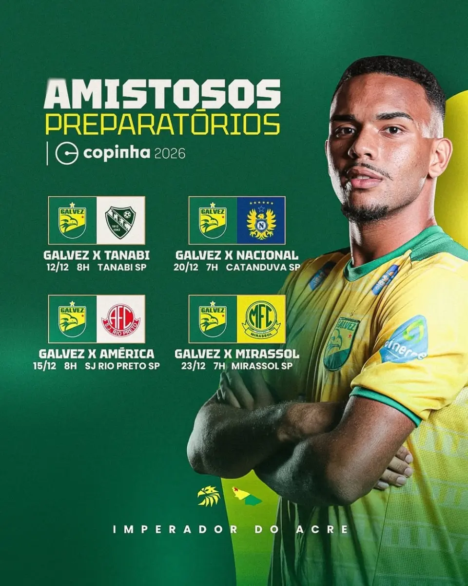 Na sequência, o Galvez enfrenta o América-SP no dia 15 de dezembro, às 8h, em São José do Rio Preto. Já no dia 20, o adversário será o Nacional-AM, às 7h, em Catanduva (SP). O último compromisso preparatório está marcado para o dia 23 de dezembro, contra o Mirassol, também às 7h, na cidade de Mirassol (SP).