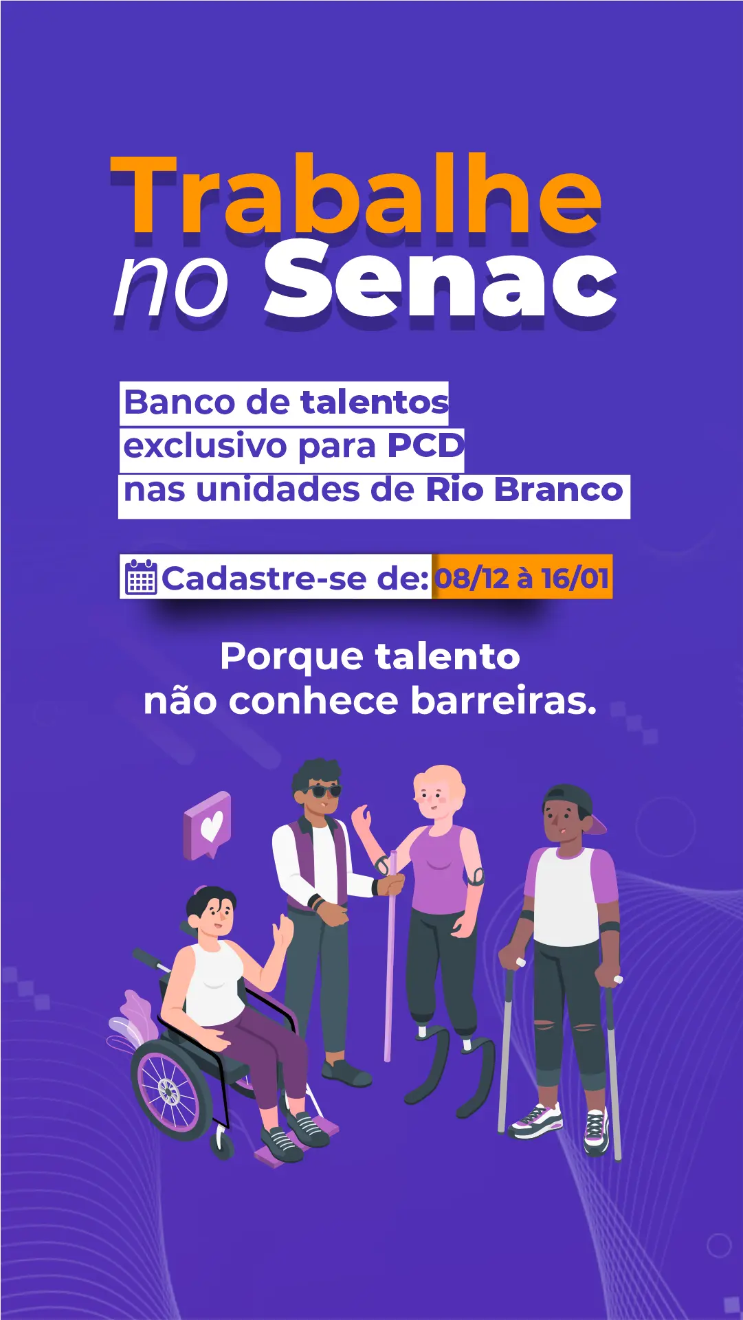 O Senac Acre está com inscrições abertas para o seu Banco de Talentos exclusivo para Pessoas com Deficiência (PcD). A iniciativa visa formar um cadastro reserva qualificado para futuras contratações na instituição. As inscrições acontecem de 8 de dezembro, até 16 de janeiro de 2026 exclusivamente pelo endereço https://portal.ac.senac.br/ trabalhe-conosco.