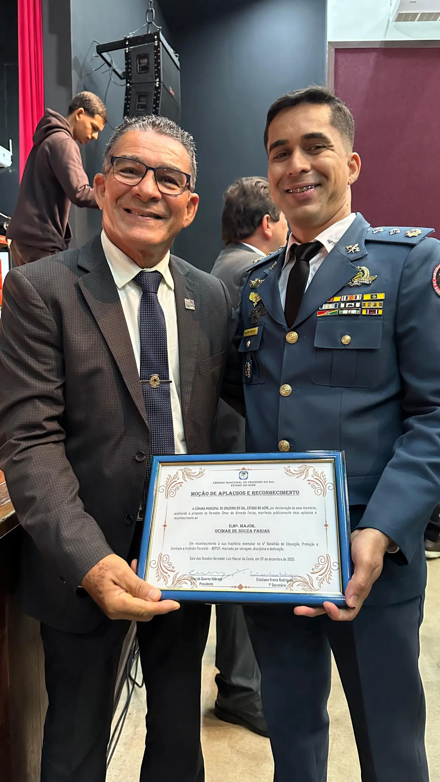 Entre os homenageados esteve o major Ocimar Farias, do Corpo de Bombeiros, que recebeu a moção de aplausos das mãos do pai, o vereador Mazinho da BR. Emocionado, o major destacou a importância do reconhecimento. “Fico extremamente feliz e agradecido pela homenagem, não só a mim, mas a todas as pessoas que prestaram serviços à população de Cruzeiro do Sul. Considero uma justa homenagem às pessoas que deixaram um legado em forma de trabalho e dedicação”, disse.