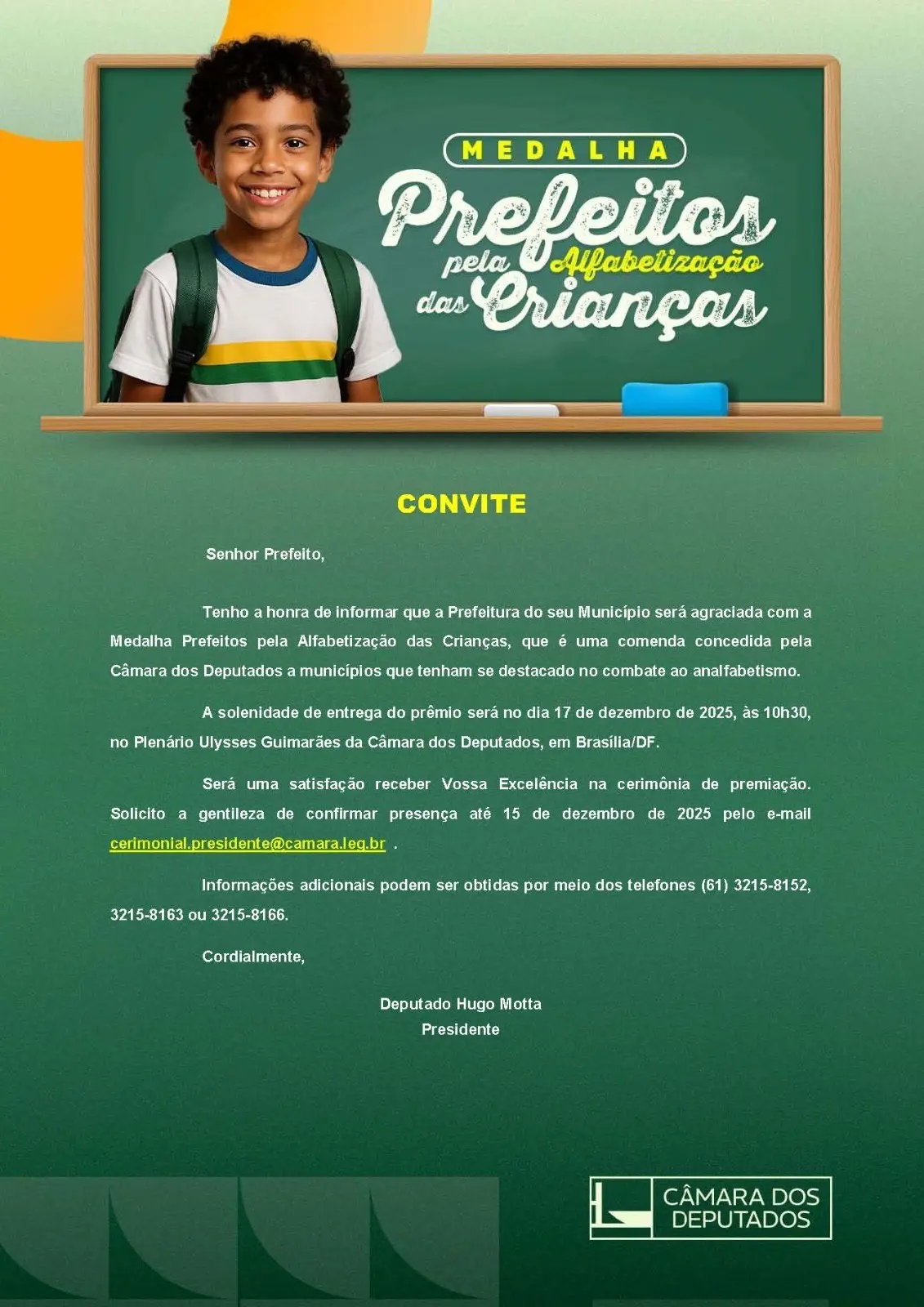 O presidente da Câmara dos Deputados, deputado Hugo Motta, destacou que será uma satisfação receber as autoridades do município na solenidade, reforçando a importância do compromisso local com a educação das crianças brasileiras.