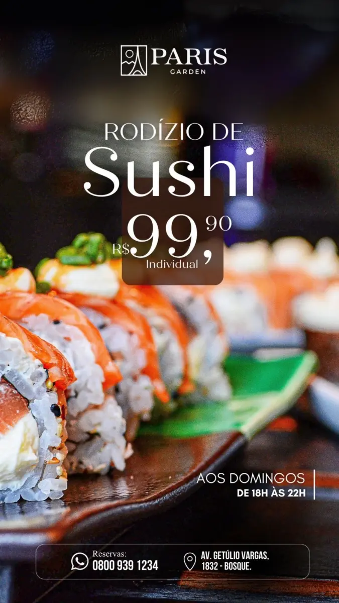 O restaurante Paris Garden, localizado na Avenida Getúlio Vargas, nº 1832, no bairro Bosque, disponibiliza aos apreciadores da culinária japonesa o rodízio de sushi aos domingos.