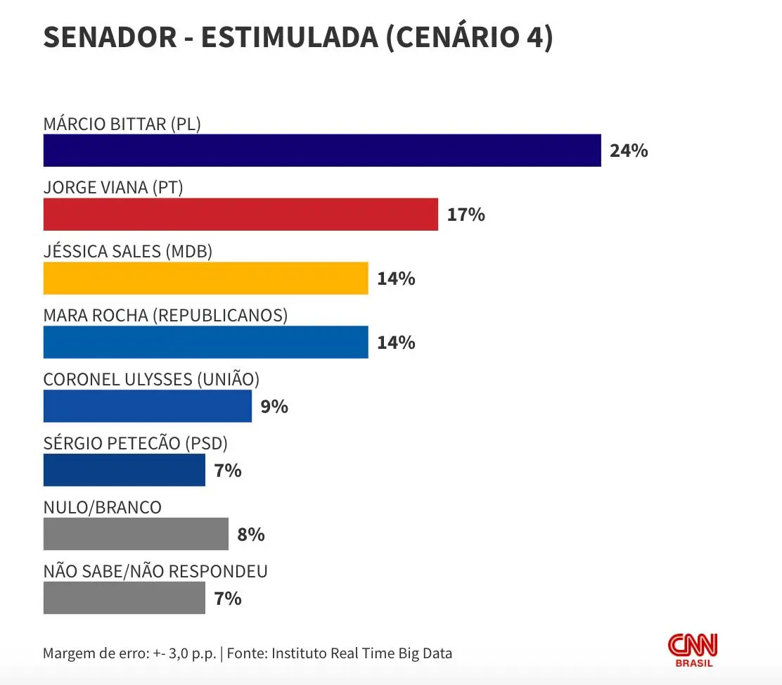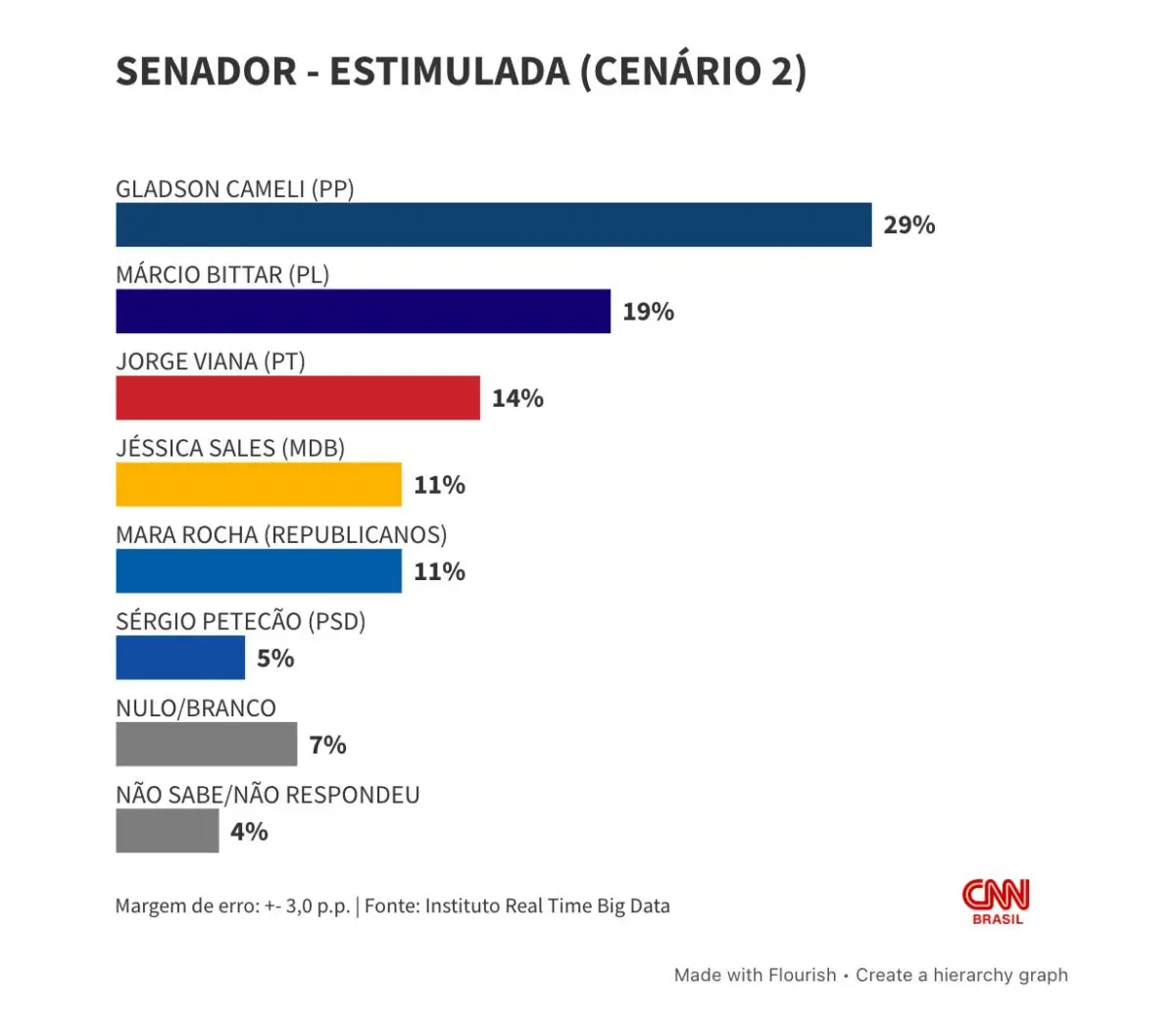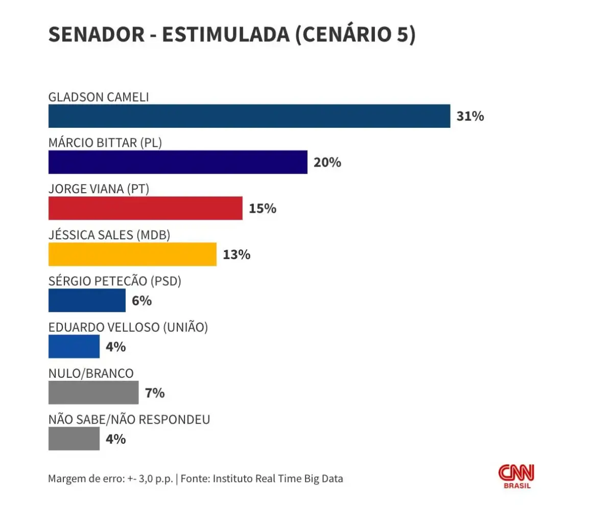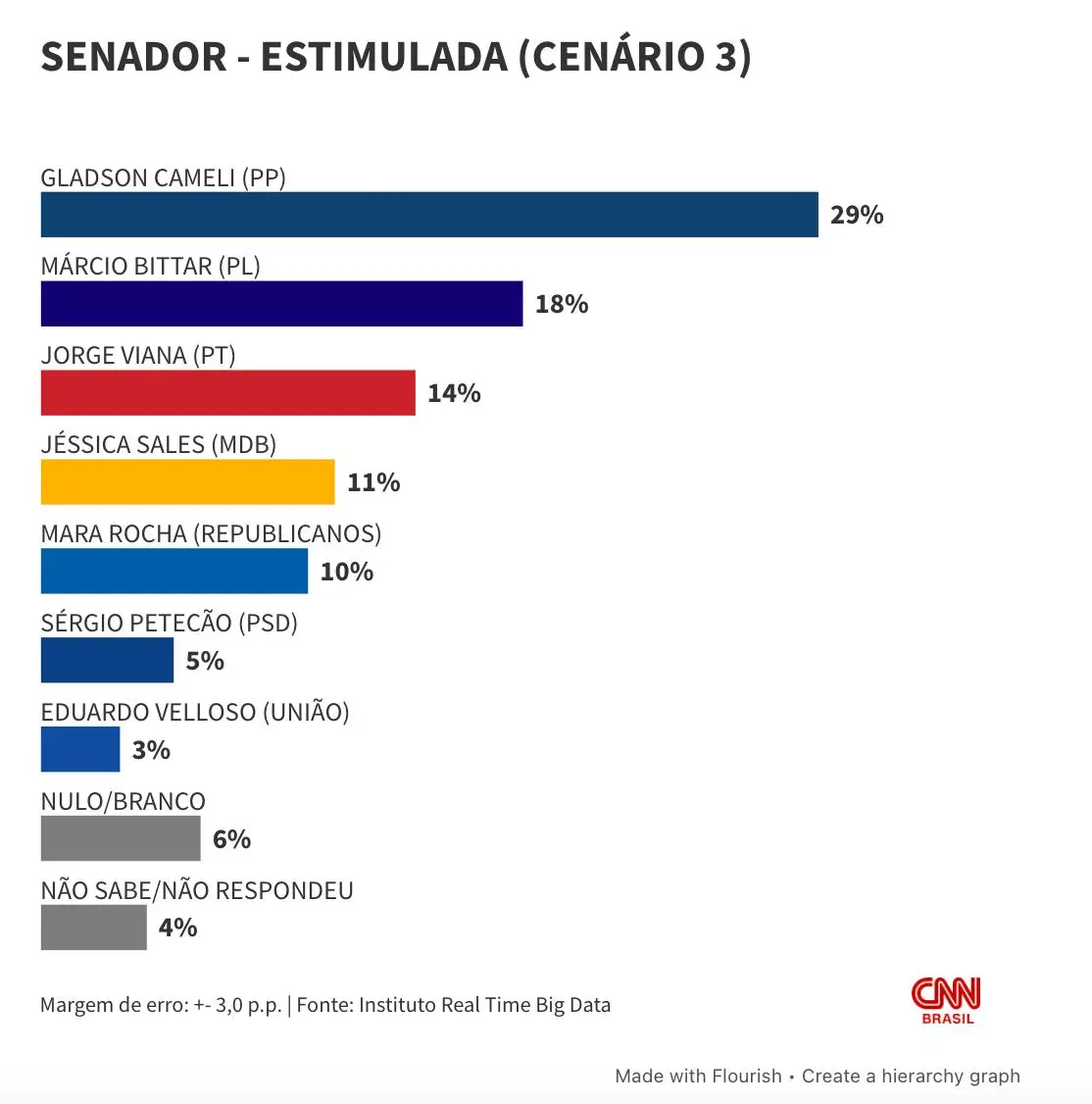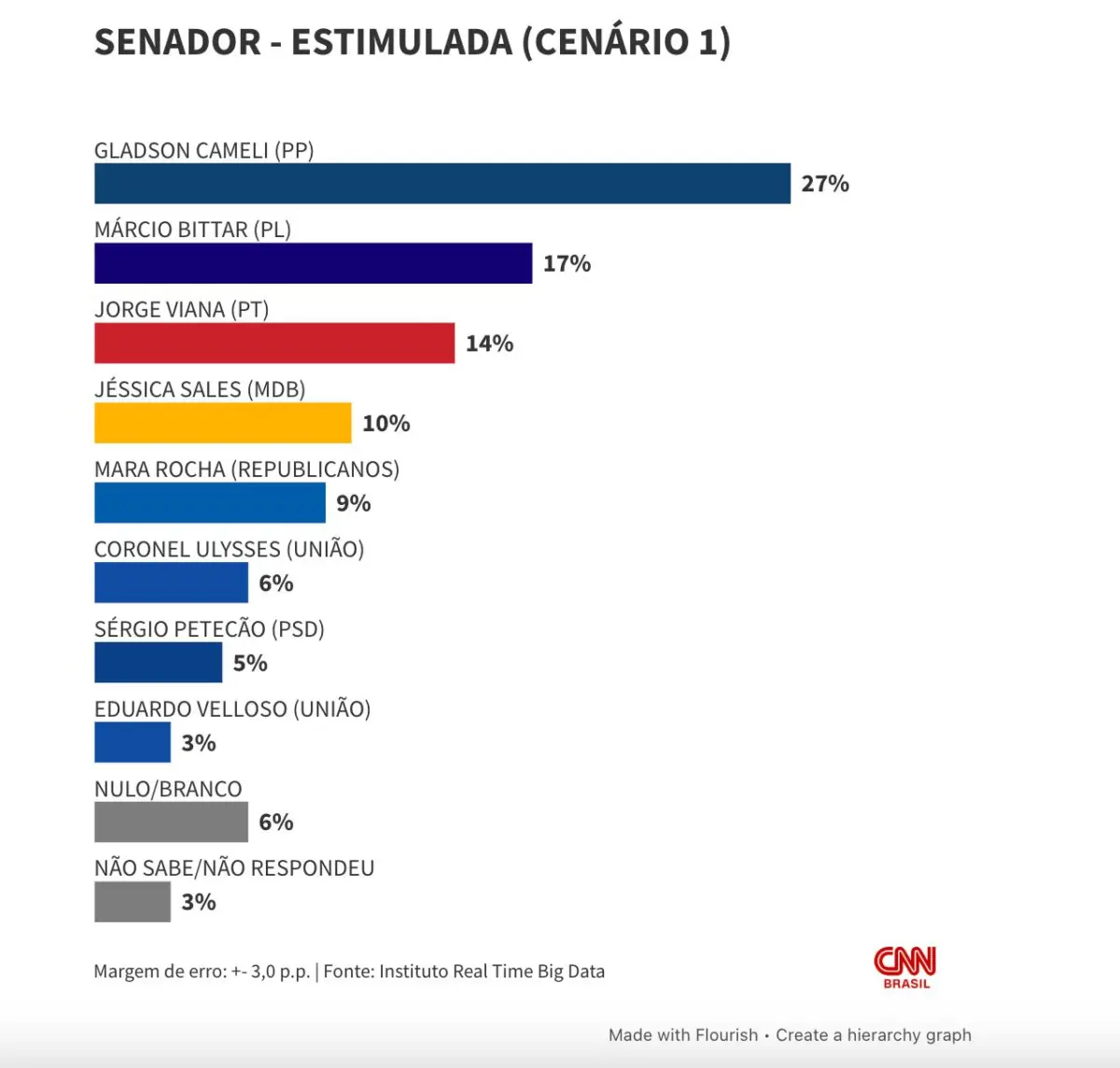 No primeiro cenário testado, Cameli aparece com 27%, contra 17% do senador Márcio Bittar (PL). Na sequência, o também senador e presidente da Apex Brasil (Agência Brasileira de Promoção de Exportações e Investimentos), Jorge Viana (PT), tem 14%.