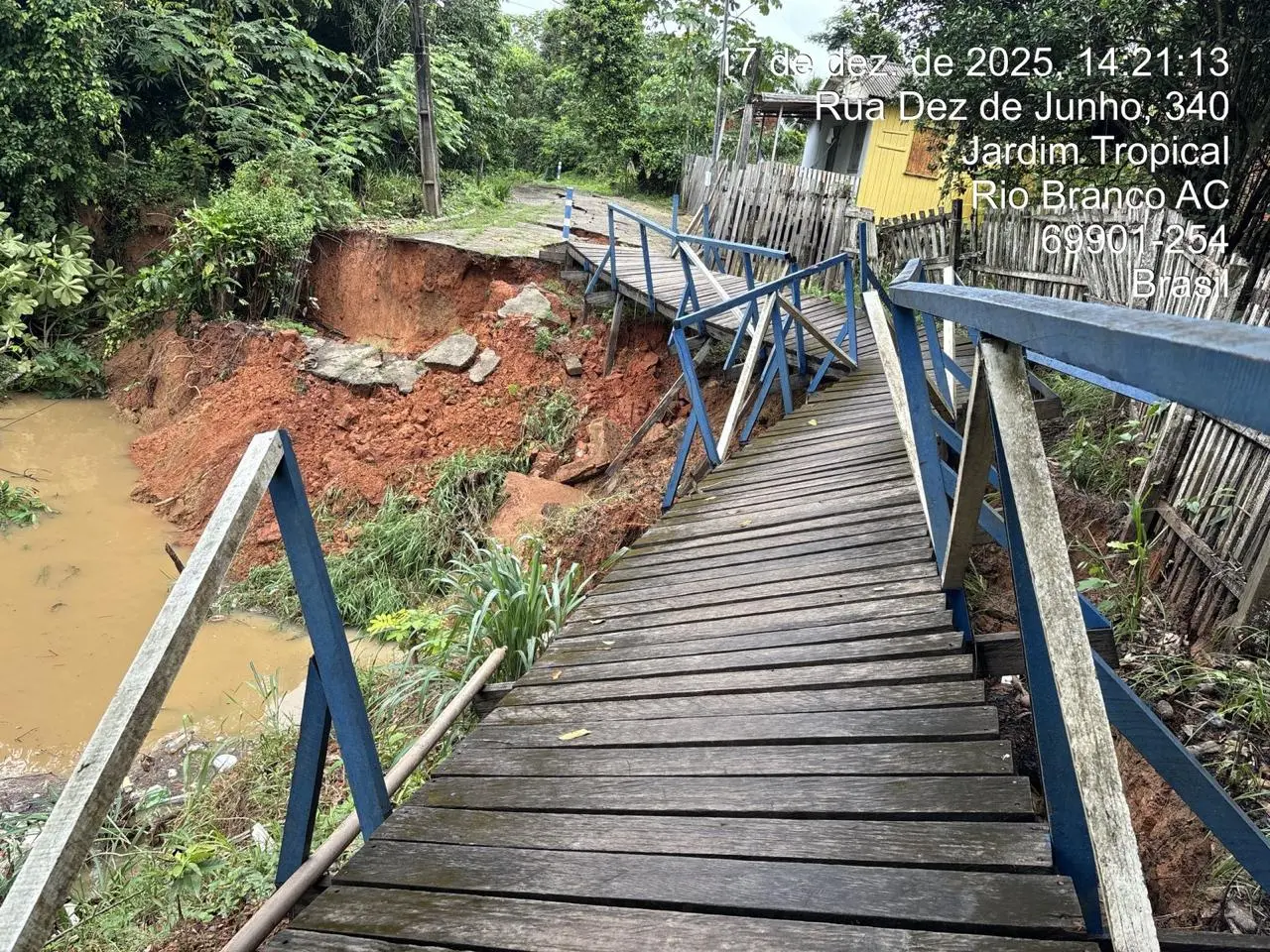 Imagens divulgadas pelo tenente-coronel Cláudio Falcão, coordenador da Defesa Civil de Rio Branco, mostram a passarela danificada no Jardim Tropical, com parte da estrutura comprometida, além de uma casa no bairro Vitória que teve a parede invadida por terra após o deslizamento.