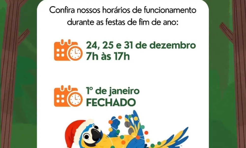 De acordo com o comunicado, o parque estará aberto nos dias 24, 25 e 31 de dezembro, com atendimento ao público das 7h às 17h. Já no dia 1º de janeiro, o local permanecerá fechado em razão do feriado de Ano-Novo.