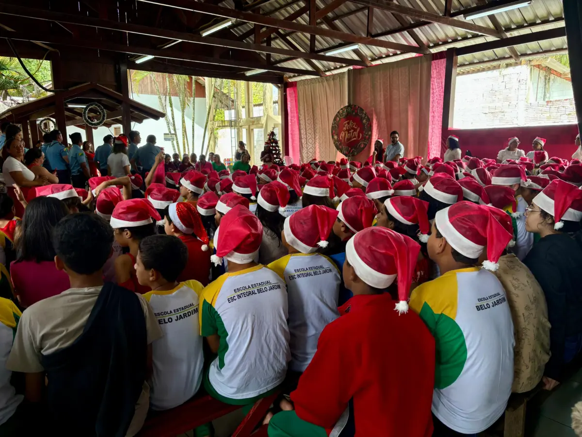 A ação integra a quarta edição da campanha “Adote um Sonho e Faça uma Criança Feliz”, do Ministério Público do Estado do Acre (MPAC), que promoveu um momento de confraternização com a presença do Papai Noel e a participação da comunidade escolar, envolvendo estudantes, equipe pedagógica e familiares.