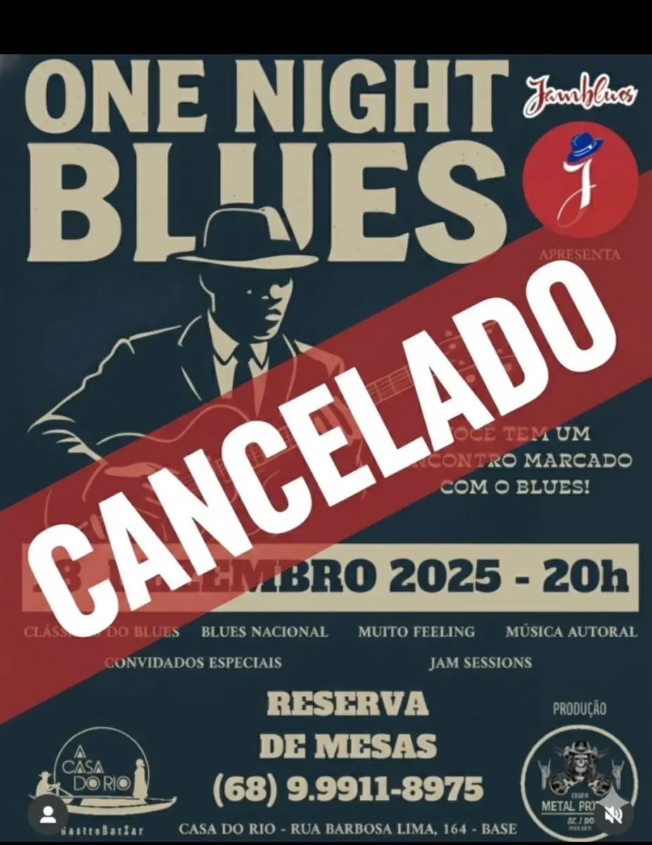 O evento “One Night Blues”, que seria realizado nesta quinta-feira, 18, na Casa do Rio, em Rio Branco, foi cancelado. A informação foi divulgada pela própria banda Jamblues por meio de uma nota oficial publicada nas redes sociais.