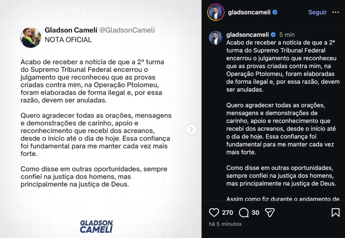 Em nota oficial publicada logo após o fim do julgamento no plenário virtual, Cameli afirmou ter recebido com serenidade a decisão da Corte e destacou que o STF reconheceu a ilegalidade das provas utilizadas na investigação. “Acabo de receber a notícia de que a 2ª Turma do Supremo Tribunal Federal encerrou o julgamento que reconheceu que as provas criadas contra mim, na Operação Ptolomeu, foram elaboradas de forma ilegal e, por essa razão, devem ser anuladas”, escreveu.