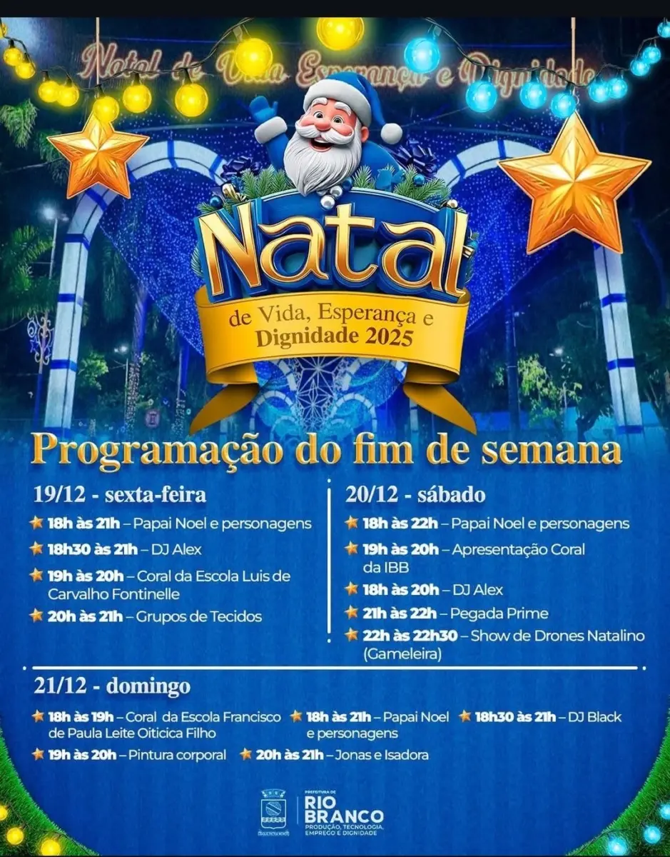 A programação do “Natal de Vida, Esperança e Dignidade 2025”, na Praça da Revolução, promovido pela Prefeitura de Rio Branco neste fim de semana conta com apresentações de corais, atrações musicais com DJs, atividades culturais, interação com o Papai Noel e personagens, além de um show especial de drones.
