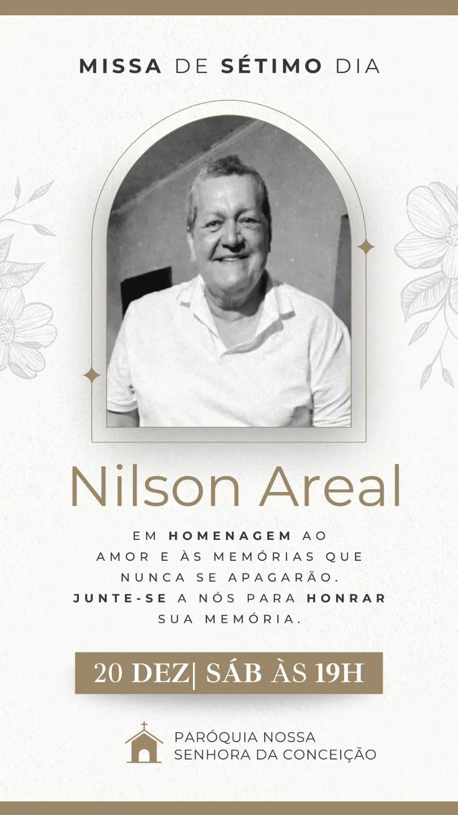 Será realizada neste sábado, 20 de dezembro, a missa de sétimo dia em homenagem ao ex-prefeito de Sena Madureira, Nilson Roberto Areal de Almeida, conhecido como Nilson Areal. A celebração está marcada para as 19h, na Paróquia Nossa Senhora da Conceição, no município.