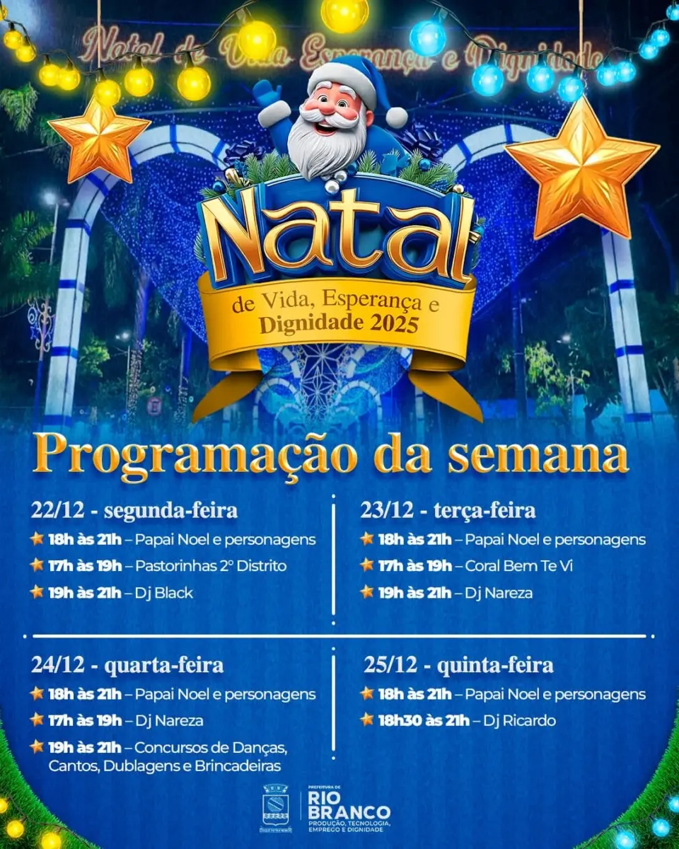A programação do Natal de Vida, Esperança e Dignidade 2025, da prefeitura de Rio Branco, continua nesta semana com atividades voltadas para toda a família, reunindo apresentações culturais, atrações musicais, concursos e a presença do Papai Noel e personagens natalinos.