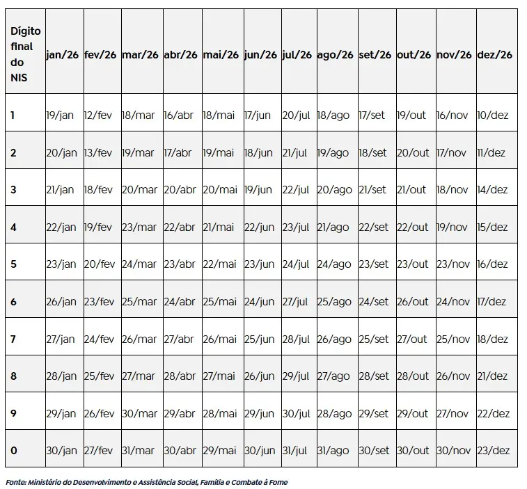 Os pagamentos ocorrerão nos últimos dez dias úteis de cada mês, de forma escalonada conforme o dígito final do Número de Inscrição Social (NIS), exceto em dezembro, quando o cronograma é antecipado em cerca de uma semana por causa do Natal.