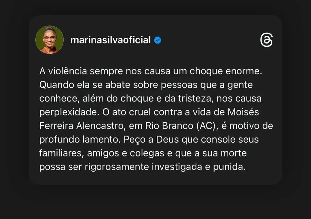 A ministra do Meio Ambiente e Mudança do Clima, Marina Silva, manifestou pesar pela morte de Moisés Ferreira Alecanstro, ocorrida em Rio Branco. A declaração foi publicada nas redes sociais da ministra na noite desta terça-feira, 23.