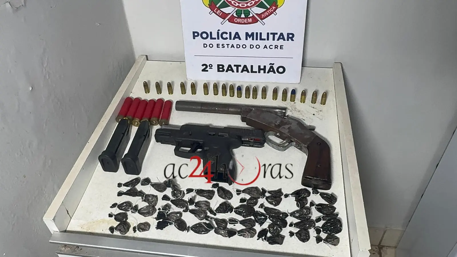 Uma ação de patrulhamento ostensivo da Polícia Militar do 2° Batalhão no bairro Belo Jardim II, em Rio Branco, terminou com a prisão em flagrante de Dioney Bruno Ferreira de Souza, de 23 anos, na noite desta terça-feira (23). A ocorrência envolveu a apreensão de armas de fogo, munições e entorpecentes.