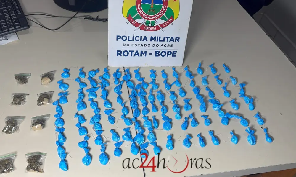 Policiais militares da Rondas Ostensivas Táticas Móveis (ROTAM), com apoio do Batalhão de Operações Especiais (BOPE), apreenderam na noite desta terça-feira, 23, entorpecentes durante patrulhamento na Rua Fluminense, no bairro Defesa Civil, em Rio Branco.