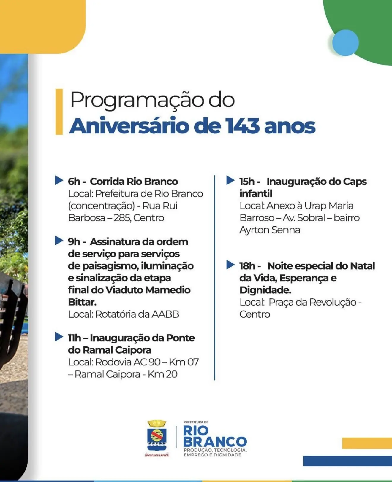 A Prefeitura de Rio Branco divulgou a programação em comemoração aos 143 anos da capital acreana, celebrados no próximo 28 de dezembro. As atividades estão distribuídas ao longo do dia e incluem eventos esportivos, inaugurações de obras, ações na área da saúde e programação cultural.