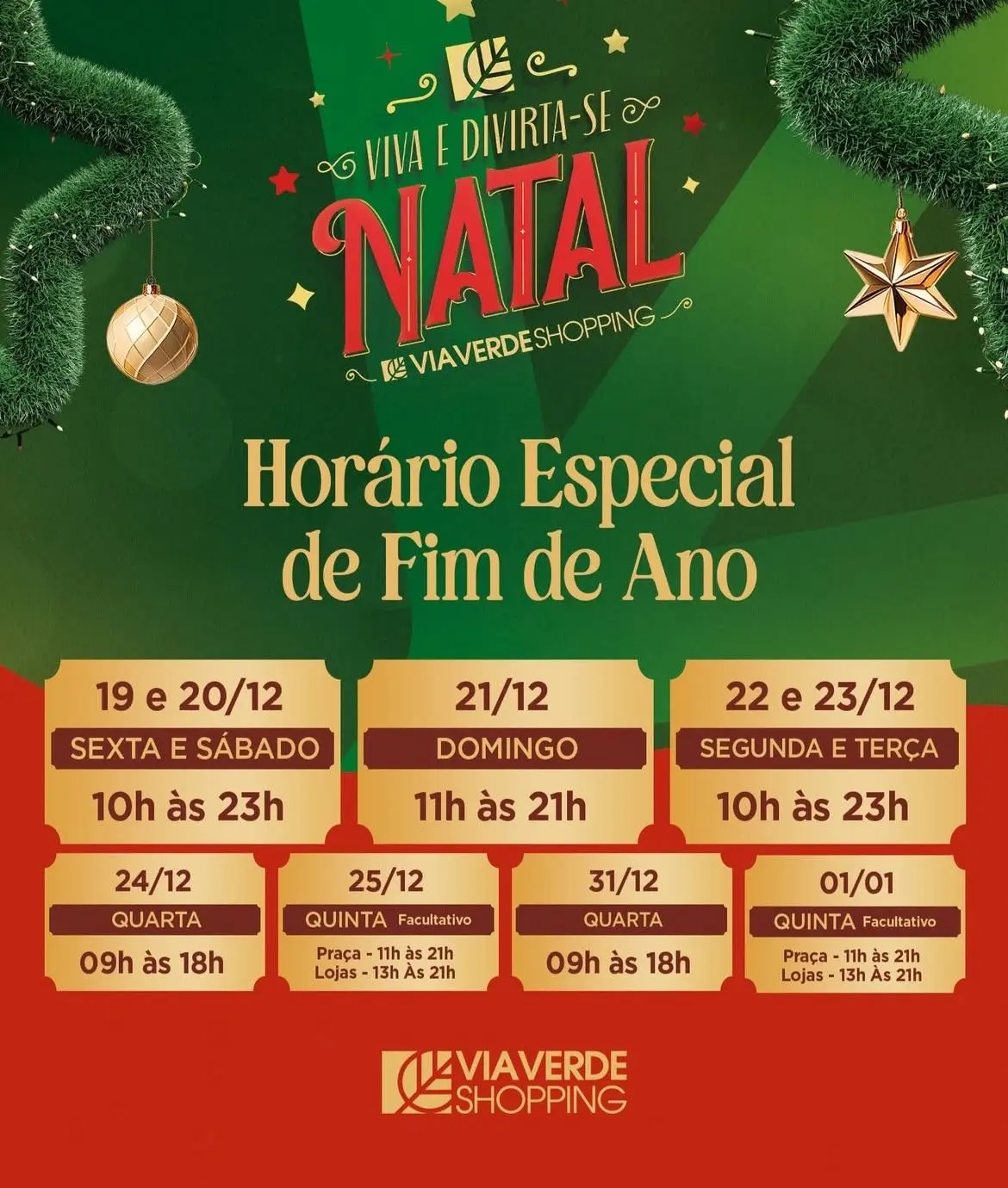 O Via Verde Shopping está operando em horário especial durante o período de festas de fim de ano, com mudanças no funcionamento das lojas, praça de alimentação e serviços nos feriados de Natal e Ano Novo. A programação diferenciada segue até o dia 1º de janeiro, com abertura facultativa para os lojistas em algumas datas.