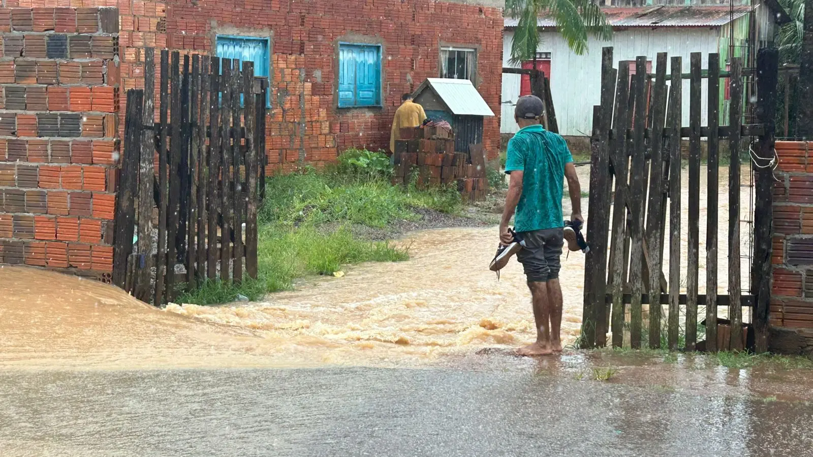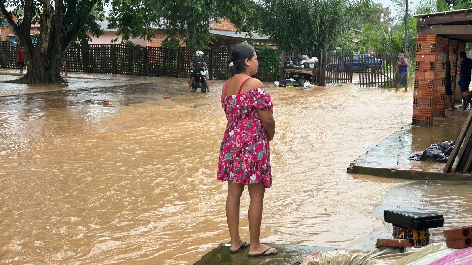 A forte chuva que atinge a capital acreana desde a madrugada desta sexta-feira (26) continua causando transtornos em diversos pontos de Rio Branco. A reportagem do ac24horas Play segue acompanhando a situação e esteve no bairro Plácido de Castro, na Travessa Tabosa, onde a água já invadiu residências.
