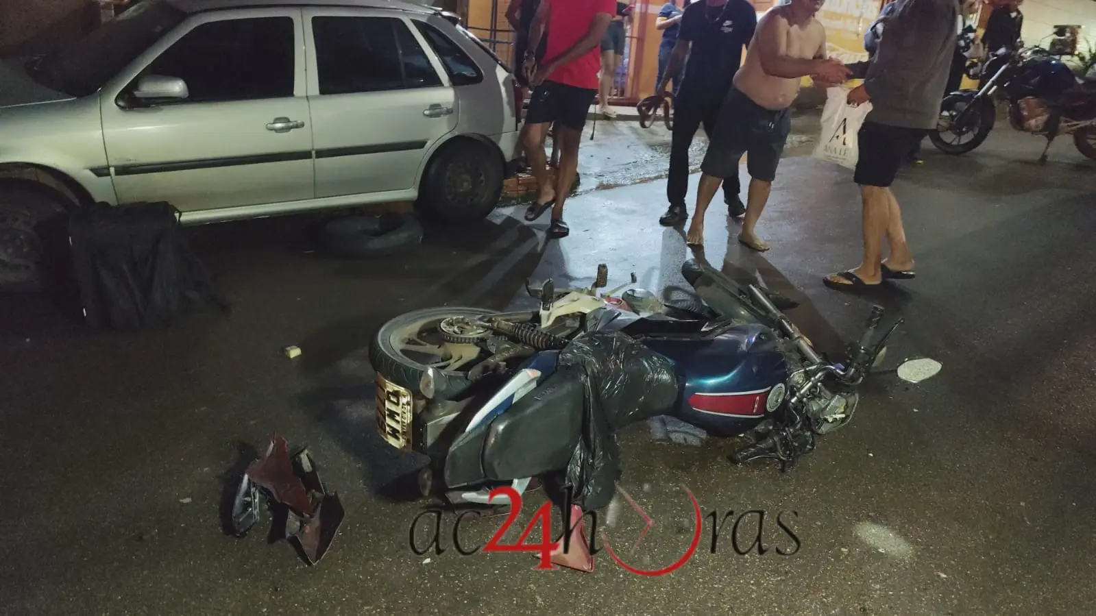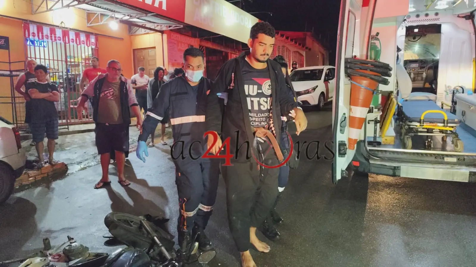 Um acidente de trânsito envolvendo duas motocicletas deixou o motoboy Henrique Max Melo Pereira dos Santos, de 22 anos, e um professor de jiu-jitsu identificado como Lucas feridos na noite desta sexta-feira, 26, na Rua Nobre, no bairro Chico Mendes, em Rio Branco.