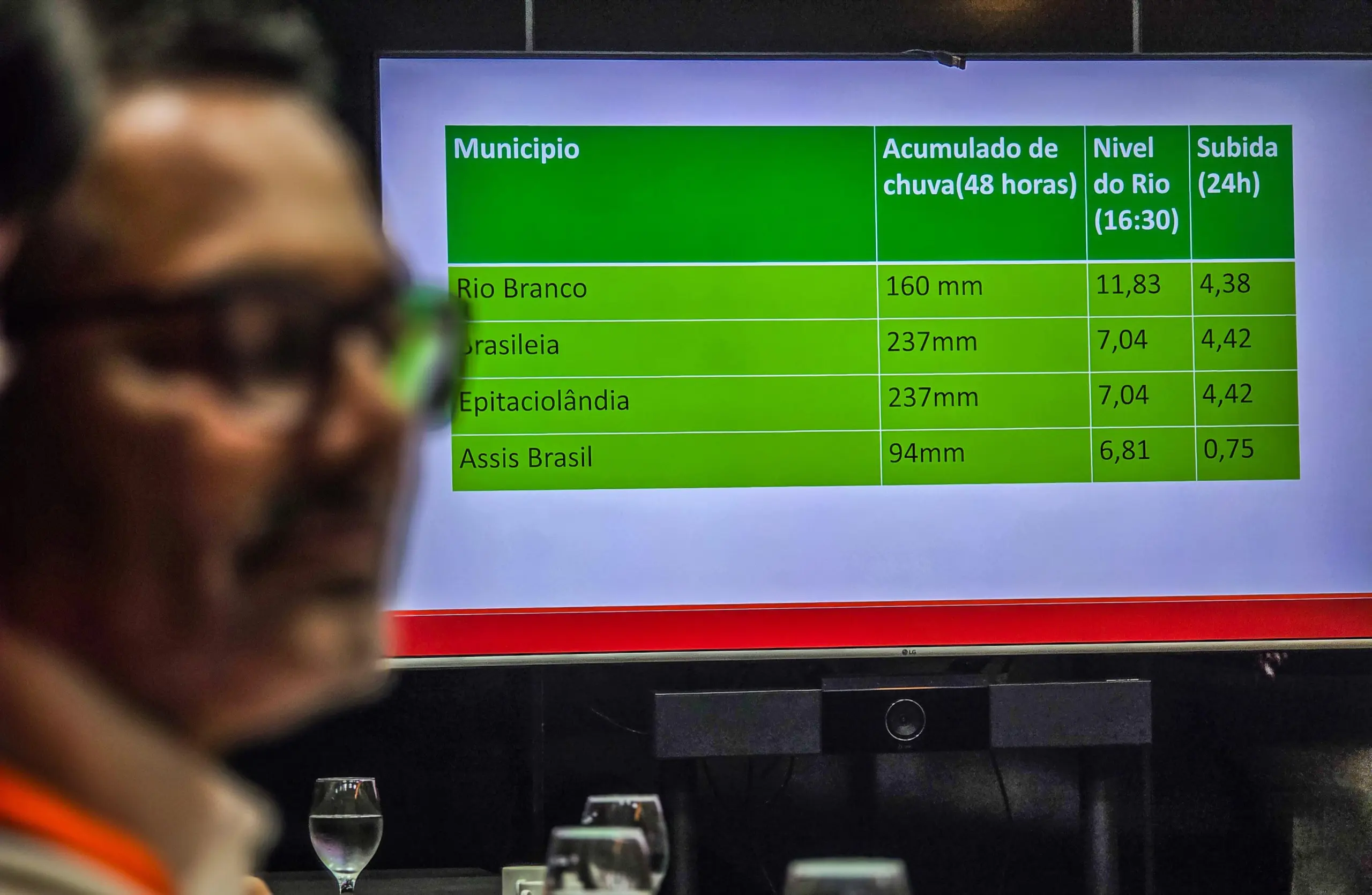 O nível do Rio Acre, segundo a apresentação, atingia cerca de 12,20 metros no momento da reunião, com uma subida considerada acelerada nas últimas 24 horas. A preocupação maior, conforme frisou o coordenador, é o fato de o rio estar se aproximando da cota de alerta em Rio Branco, fixada em 13,50 metros. “Se continuar nesse ritmo e com as previsões de mais chuva para os próximos dias, o cenário exige atenção máxima”, alertou.