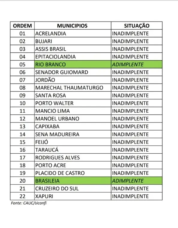 Dos 22 municípios do Acre, 20 estão impossibilitados de receber recursos do governo federal por não cumprirem recomendações do Sistema de Informações sobre Requisitos Fiscais (CAUC). Apenas Brasiléia e Rio Branco estão adimplentes com esse sistema, atendendo a todas as exigências legais para a celebração de convênios e o recebimento de transferências voluntárias de recursos da União.