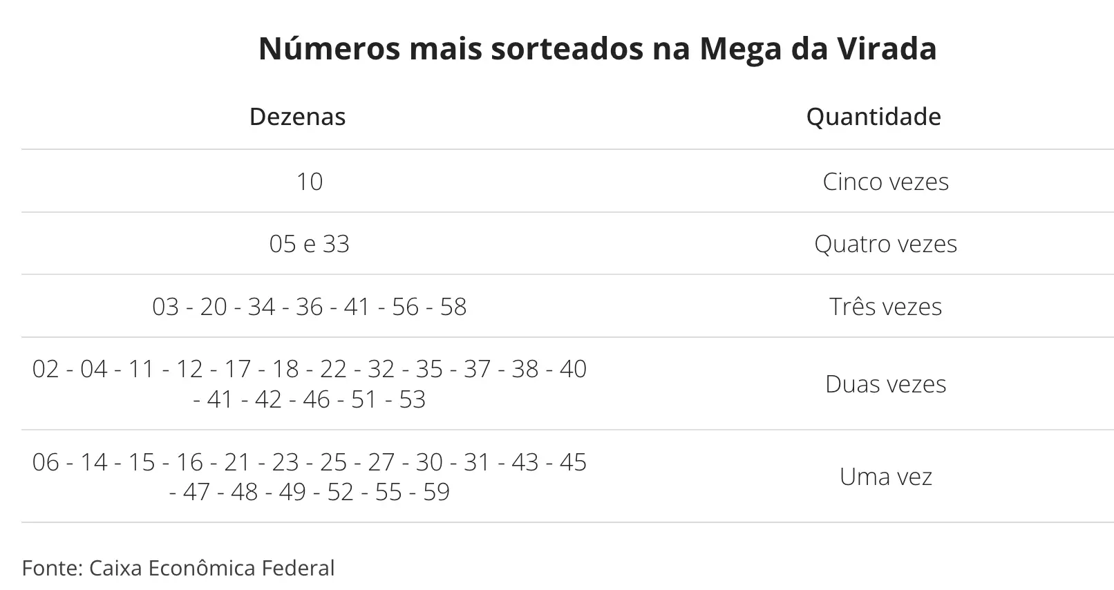 Segundo a Caixa Econômica Federal, o número 10 é o mais recorrente na história do concurso, tendo sido sorteado em cinco edições até agora.